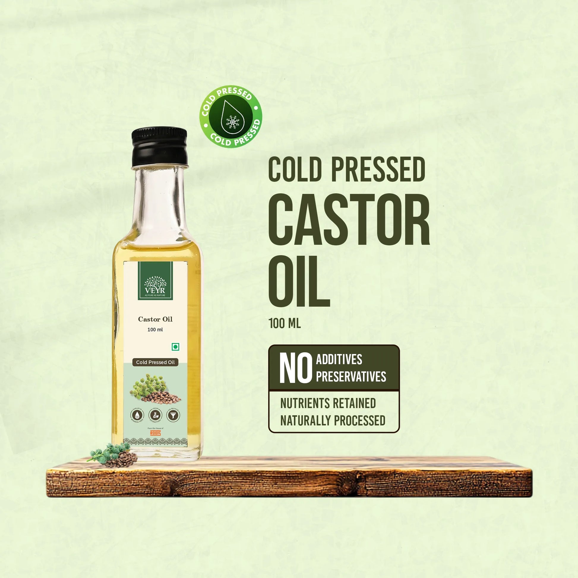 Cold Pressed Castor Oil by Veyr Organics is extracted from the seeds of the castor plant using a mechanical pressing method at low temperatures. This gentle extraction process preserves the oil's natural nutrients, making it a premium choice for skincare, haircare, and therapeutic purposes.