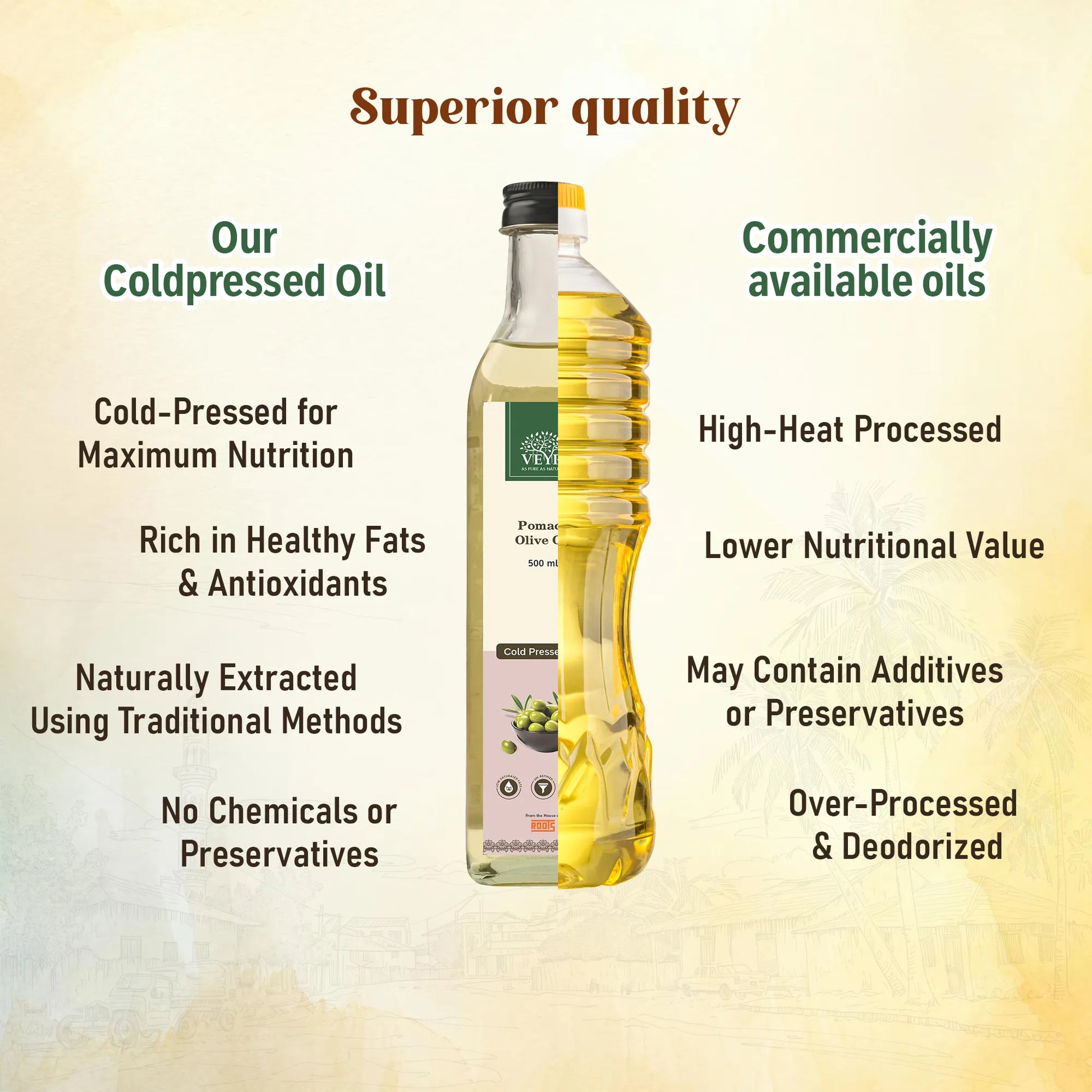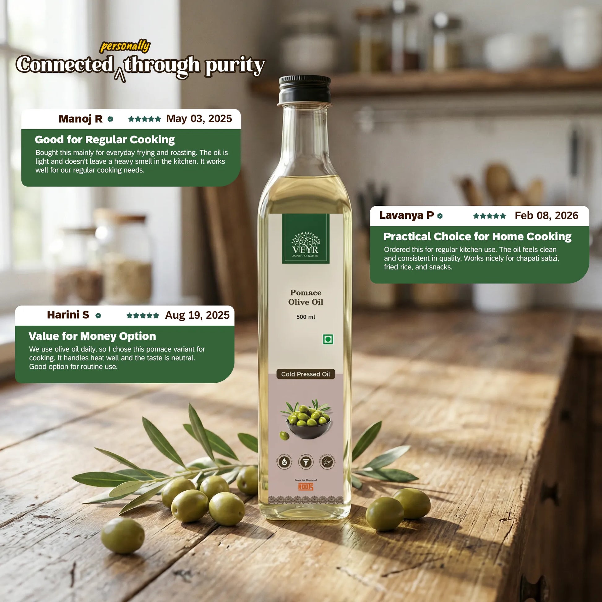 Pomace Olive Oil by Veyr Organics offers numerous benefits. Pomace oil is ideal for frying, and cooking dishes without compromising on taste. Its versatility extends to marinades, dressings, and baking, enhancing flavors while maintaining nutritional integrity.